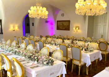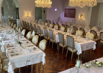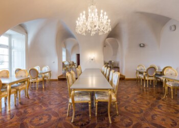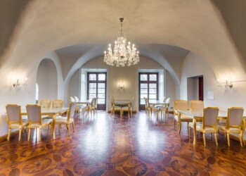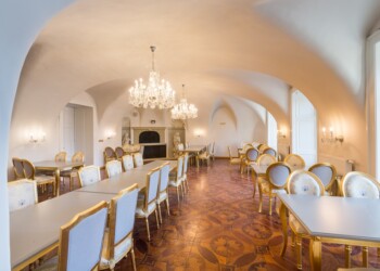 Mobiliár sály predstavujú kópie historického nábytku z doby Ludviga XIV s povrchovou úpravou plátkového zlata. Osvetlenie je formou historických lustrov Carate s použitím kryštálov K1.